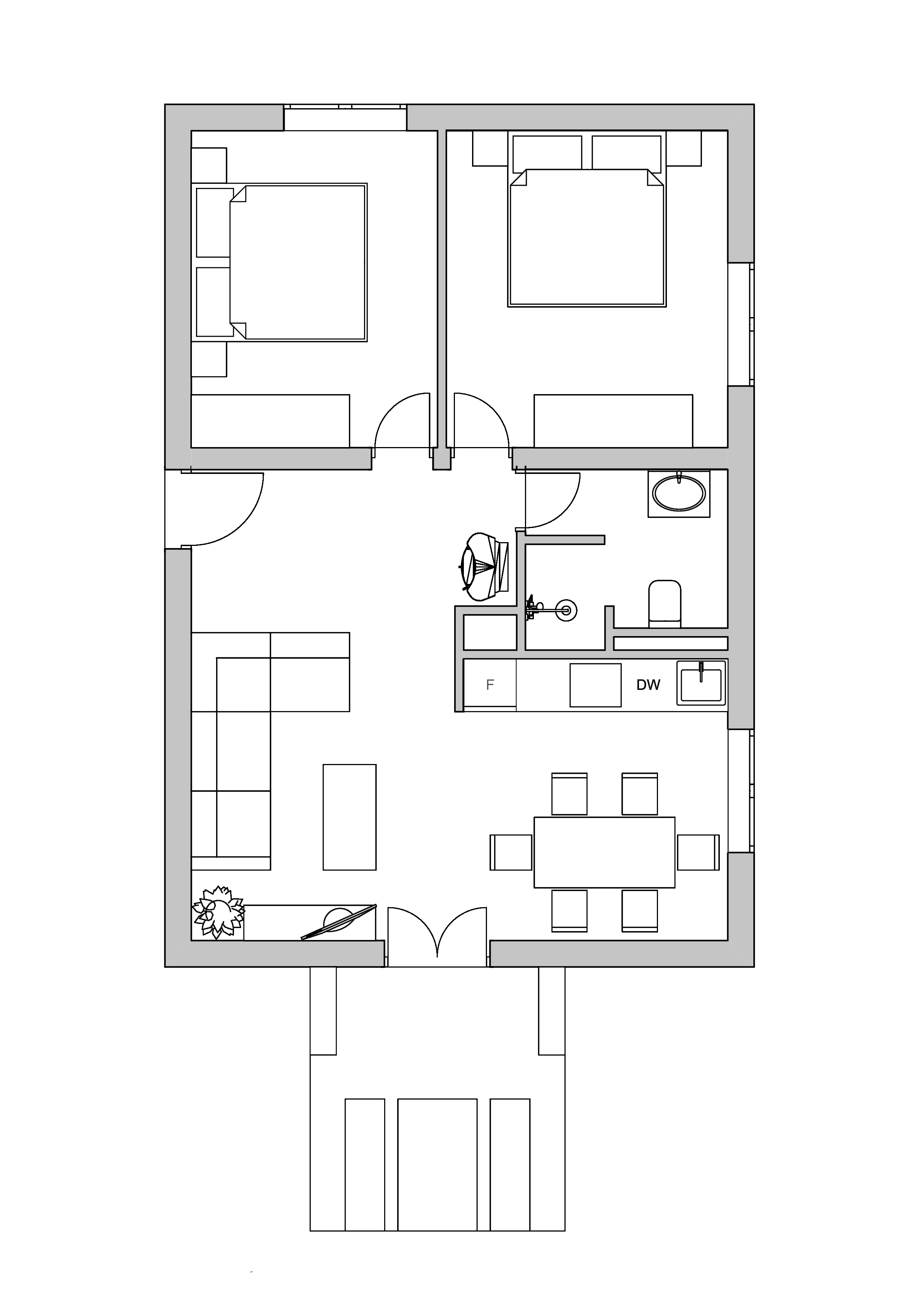 Apartman Medo od 60 m2 u suterenu velike kuće ima dvije spavaće sobe opremljene bračnim krevetima (uz koje Vam možemo staviti dječji krevetić), noćnim ormarićima s lampama te velikim garderobnim ormarom; zatim kupaonica u kojoj se nalaze zidana tuš kabina, WC i ormarić s umivaonikom i ogledalom te kuhinja i blagovaonica koji se sastoje od frižidera, pećnice, električne ploče za kuhanje, perilice posuđa, kuhala za vodu i stola za 6 osoba i dio su dnevnog boravka u kojem se nalazi sjedeća garnitura za 6 osoba koja postaje dodatni ležaj za 1 do 2 osobe, zatim TV, stolić, komoda i ogledalo s vješalicama kraj ulaznih vrata.